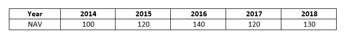 Assuming a fund’s NAV (Net Asset Value) at inception in 2014 is 100 we can see that in 2015 it had a return of 20% and the NAV grew to 120. The fund will take 20% of the 20 that it made in profit (Year 2 NAV – Year 1 NAV which is equal to 120 – 100 = 20 from the table above). Therefore 120 is the High-Watermark at this stage.
