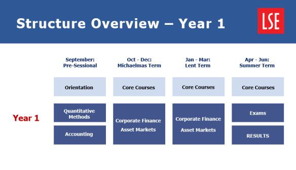 Before starting the core courses, you will have the pre-sessional part in September which consists of a few introductory weeks aimed at getting you up to speed with a lot of the basic (and not so basic) concepts that the core modules build upon. In addition to going through some basic accounting materials (indispensable for the corporate finance module), the classes will also cover some of the mathematical concepts that are required in the Asset Markets module.